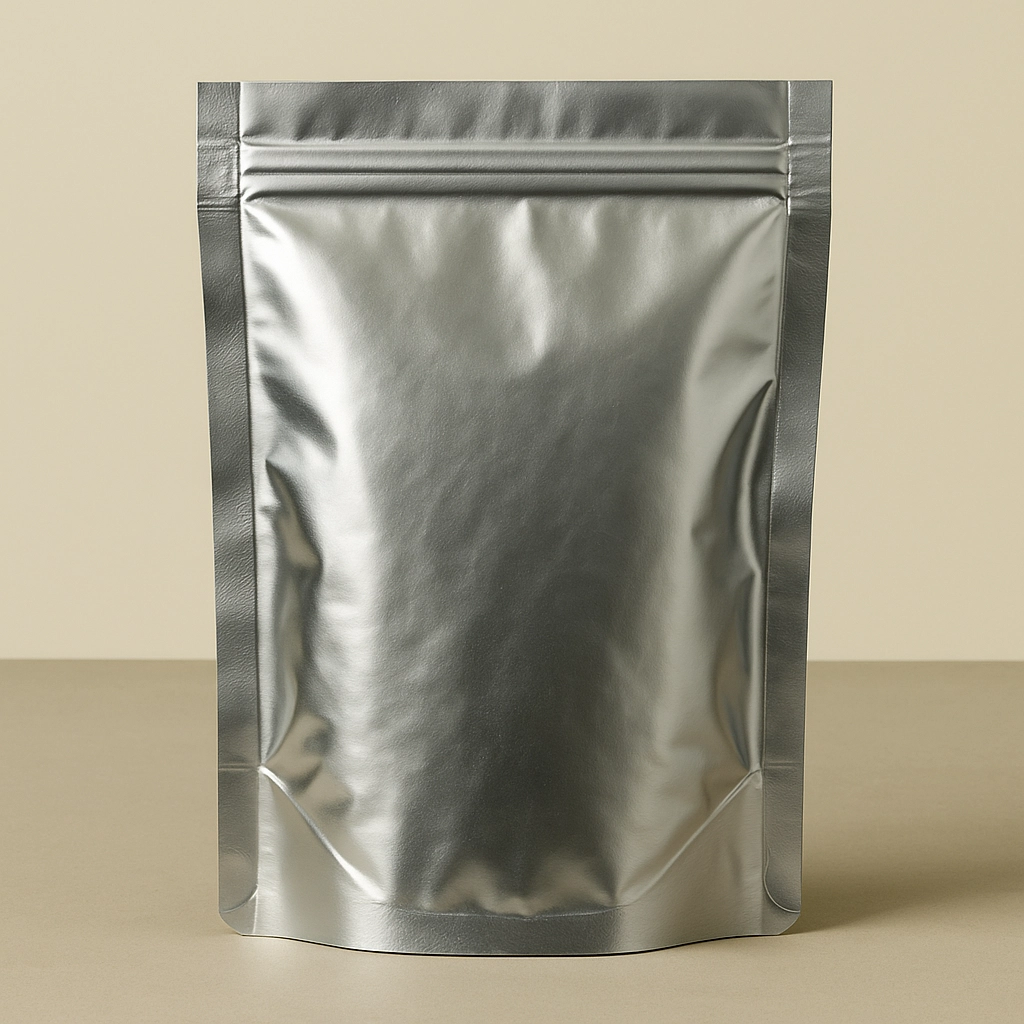 アルミパウチは、アルミ箔を含む多層フィルムで作られたパウチです。高い遮光性・バリア性を持つのが強みで、内容物の酸化や吸湿、光による劣化を防ぎ、長期間にわたって品質を維持できます。