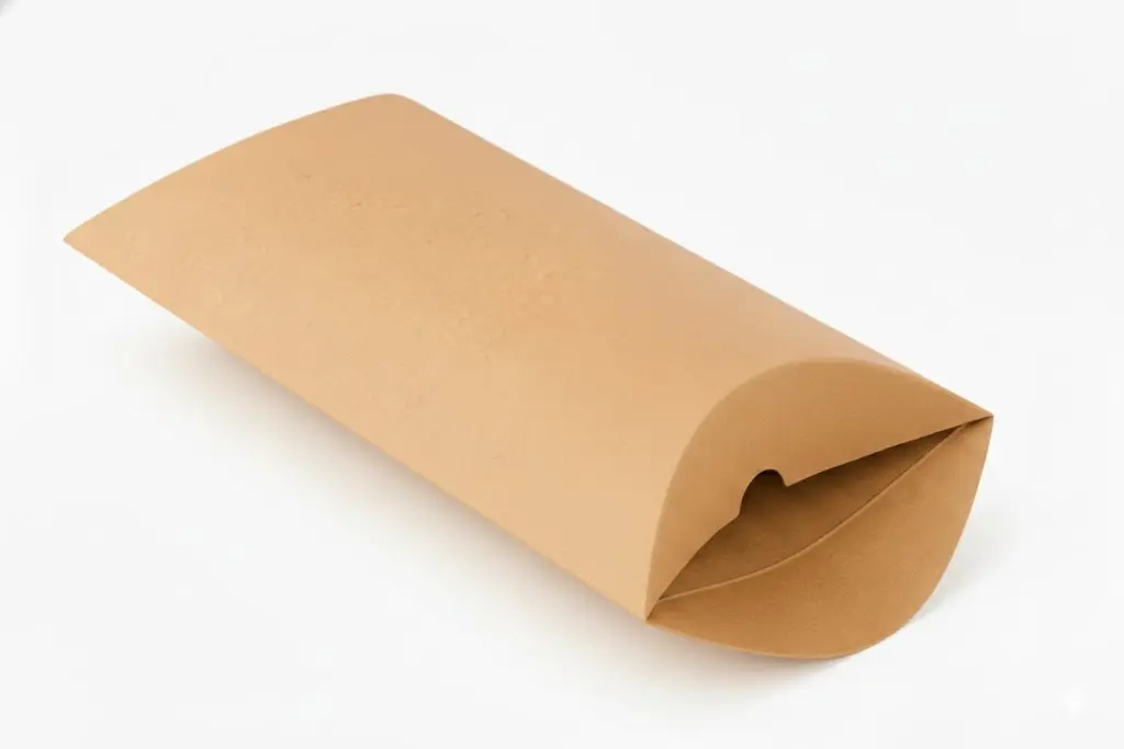 ピローケースは、封筒のような形状に、曲線状の折り目がついたフタを折り込んで閉じる化粧箱です。組み立てると枕(ピロー)のようなやわらかなフォルムになることから、この名前で呼ばれています。