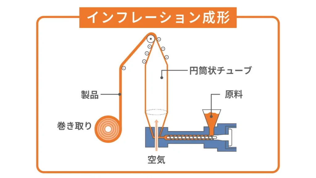 インフレーション成形は、薄いフィルム状の製品を作るための製造方法です。まず、加熱して溶かしたプラスチックを円形の口金からチューブ状に押し出し、その内部に空気を吹き込んで膨らませます。このとき、風船のように膨らんだチューブを冷却しながら巻き取ることで、継ぎ目のない均一な厚みを持つフィルムが成形可能です。