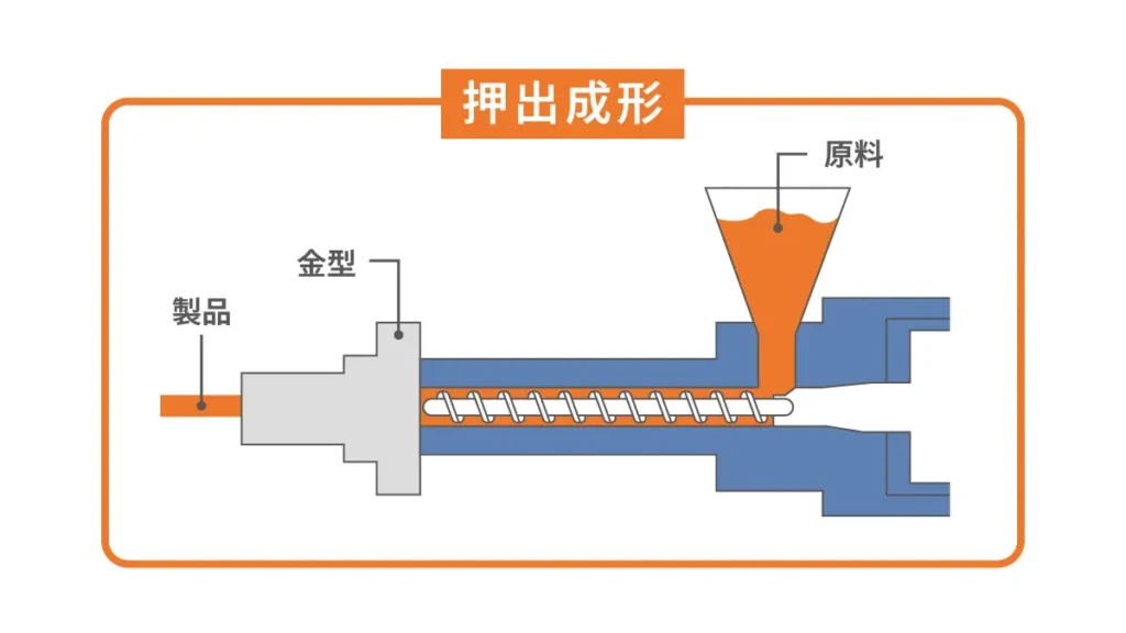押出成形は、熱で溶融させたプラスチック材料を、特定の断面形状を持つ口金(ダイ)から連続的に押し出す製造方法です。「ところてん」の原理と同じで、ストローやパイプ、フィルムのように、どこで切っても断面が同じ形状になる長尺製品の生産に用いられます。
