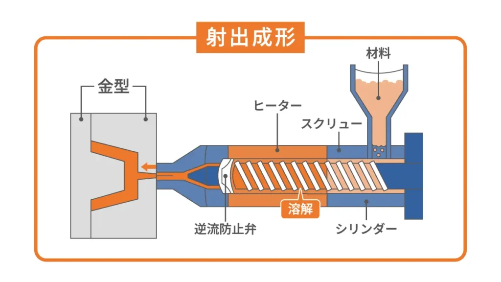 射出成形(インジェクション成形)は、加熱して溶かしたプラスチックを金型に高圧で注入し、冷却・固化させることで成形する方法です。文字通り「注射」のように材料を流し込むことから、この名がついています。
