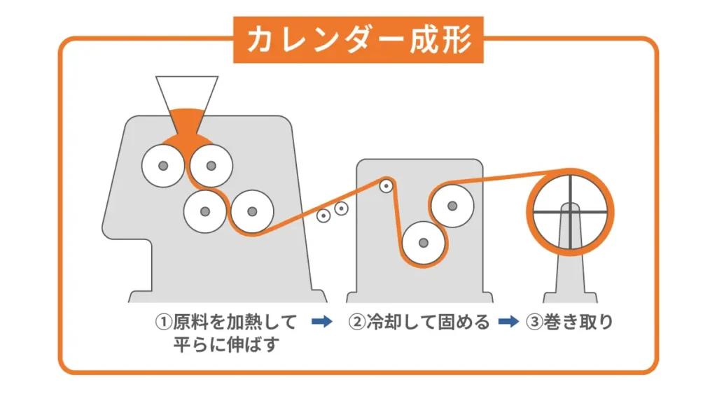 カレンダー成形は、熱で練ったプラスチック材料を複数の加熱ロール(ローラー)の間に通し、圧力をかけて薄く引き伸ばす製造方法です。うどんやそばの生地を製麺機で伸ばす工程をイメージするとわかりやすいでしょう。